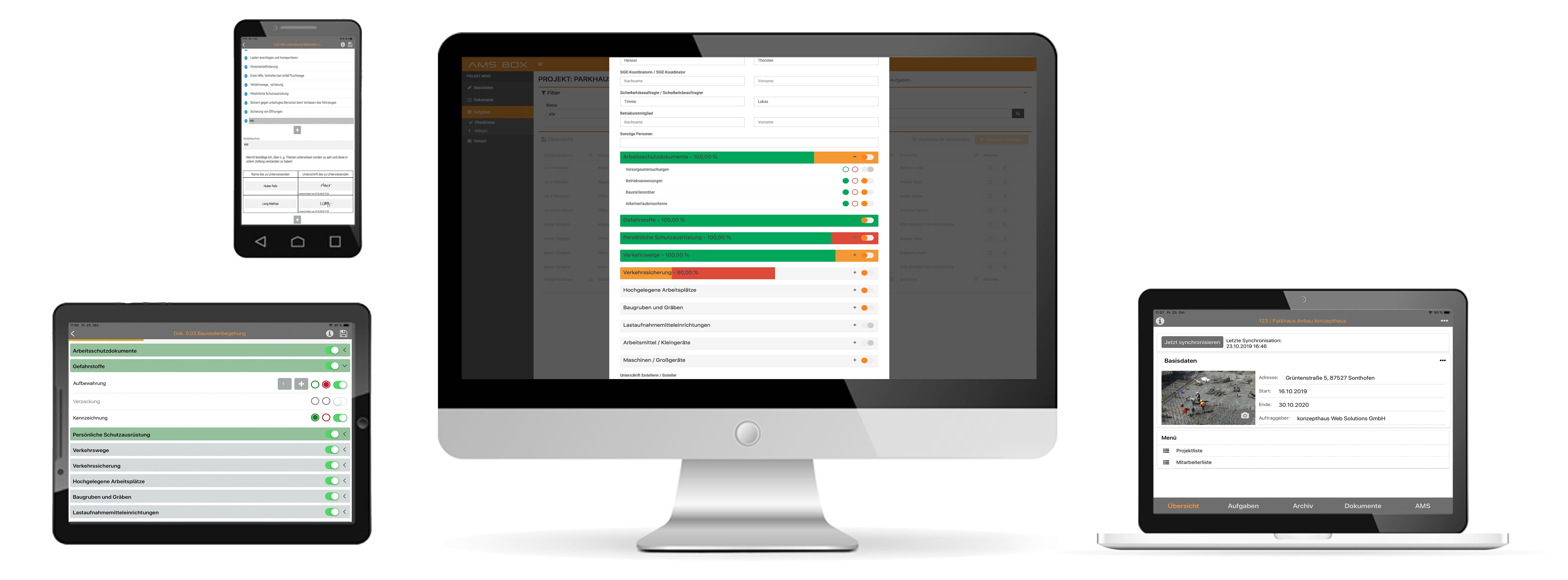 Die Programmierer von konzepthaus Web Solutions haben mit der AMS BOX App und Webseite eine Anwendung konzipiert, deren variables Datenmodel es ermöglicht, für die Kunden eine Vielzahl verschiedener Checklisten nach Wunsch zu digitalisieren. Durch die Offline-Funktionalität können Baustellenmitarbeiter ihre Daten, Checklisten und andere digitalen Formulare jederzeit per Tablet online und offline auf der Baustelle nutzen und auch gleich digital unterschreiben. Ergeben sich Mängel auf einer Baustelle, können diese sofort digital in die Checklisten eingetragen werden. Außerdem lassen sich in der App schnell und einfach Dokumente in der Struktur der 11 Arbeitsschritte hochladen, so dass diese Dokumente dann stets aktuell, auch offline, auf den Baustellen zur Verfügung stehen.